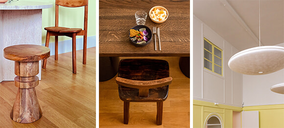 50年代の椅子、いまの時代のスツール、天井のランプ……ル・ロディアを経営するジャン=ルネ・シャシニョルのこだわりは料理に留まらず、インテリアにも。photos:(左)Mariko Omura、(中・右)Marielle Gaudr