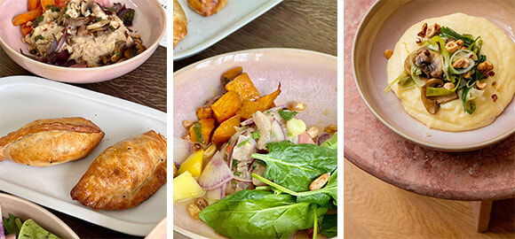 左: エンパナダスは2個から。 中: セヴィーチェのお皿にも野菜がいっぱい。 右: 日替わり料理は肉料理(17ユーロ)と野菜料理(15ユーロ)の2種。ランチタイムのセットメニューは11ユーロ〜。photos:Mariko Omura