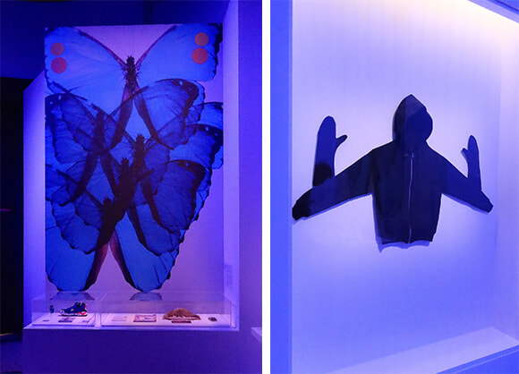 3つ目の会場となる東翼のスペースにて語られる1997年は、ダヴィデ・ソレンティの死とコレットの開店。写真は蝶をデザインしたインビテーションカードのビジュアル(左)と、コレットで販売されたジェレミー・スコットのスウェット。photos:Mariko Omura