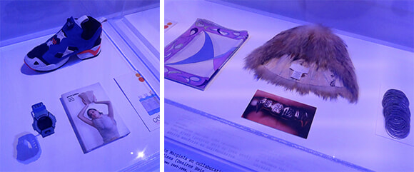 ビッグバンの一大現象として、展覧会ではコレットのために小部屋が割かれている。飛翔を象徴してデザインされたブルーの蝶が羽ばたくインビテーションカードのビジュアルが拡大されて壁を飾り、下のショーケースにはカシオのGショック、リーボックのポンプフューリーのスニーカー、キールズのプロダクトが展示されている。これらは開店時にブティックで販売された商品を紹介するプレス資料に掲載された品からのセレクションである。もうひとつのウィンドウには最近カミーユ・ミチェリによる再生が話題を呼んでいるエミリオ・プッチの当時のスカーフも。