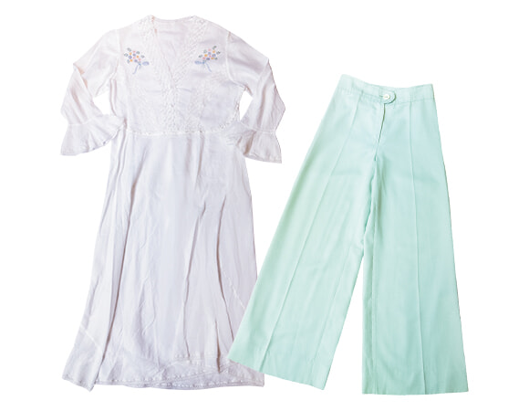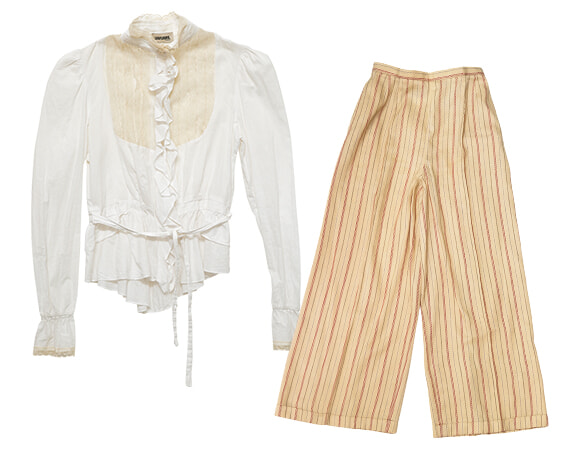 左:レ・フルールのコットンブラウス。「胸元に刺繍とレースをあしらった、フェミニンなアイテム。私だったらバギーパンツと合わせて60年代風にしたり、パンキッシュなレザースカートと合わせて甘辛ミックスで着用したい」。150ユーロ 右:パジャマ風のカジュアルなコットンリネンのケンゾーのボトムス 150ユーロ