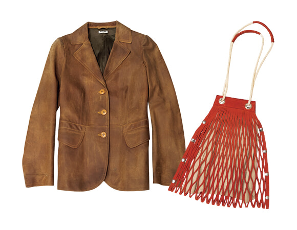 左:「メンズライクな着こなしを楽しんでほしい」と言うミュウミュウのレザージャケット 450ユーロ 右:メゾン マルジェラのレザーのフィッシュネットバッグ 400ユーロ