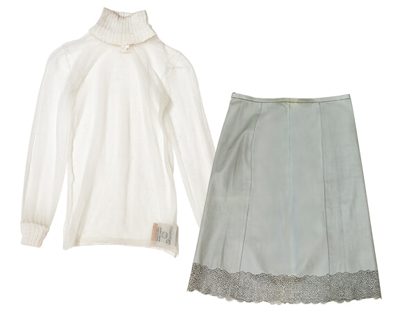 左:透ける素材を使ったクレージュのタートルネックトップ。あえてシアーな素材をレイヤードするのがマリアのおすすめコーディネート。140ユーロ 右:グッチのミドル丈レザースカート。「縁のレーザーカットの装飾が美しい。膝丈のスカートにロングブーツを合わせると今っぽいスタイルに仕上がる」とマリア。190ユーロ