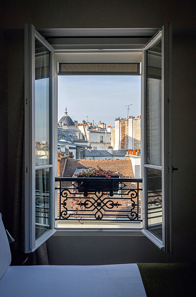 部屋の窓から見えるパリの街並みはまるで一枚の絵画のよう。