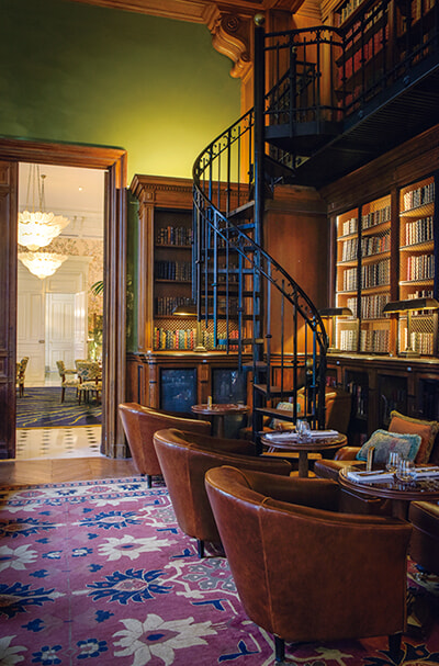 英国のクラブ風なライブラリー・バー。19世紀に図書室で使用されていた本棚をそのまま残している。
