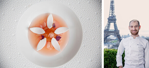 左: デザートの「アロエベラ-キウイ-ライム」(16ユーロ)は食べるのが惜しい美しさ。 右: クリエイトしたパティシエのトム・ガブリエル。photos:Pmoonetta