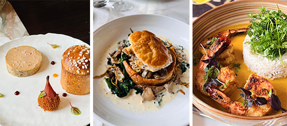 左: 前菜から、フォアグラ(32ユーロ)。 中: 肉料理のメインから、ランド地方のチキンのヴォロ・ヴォン(38ユーロ)。 右: マダガスカル産のエビ、ココナッツ・リゾット添え(40ユーロ)。photos:Mariko Omura