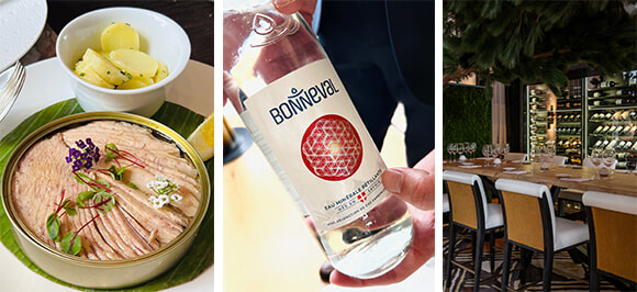 左: マグロ腹身のオリーブオイル漬け缶(210g)はNutriaブランド(55ユーロ)。カフェ・ドゥ・ロムだけが入手できたという逸品なので、シェアして味わって! 中: ナチュラルミネラルウォーターのボンヌヴァル。スティルのラベルは青。 右: ワインリストは愛好家を唸らせる品揃えだ。photos:(左・中)Mariko Omura、(右)Pmonetta