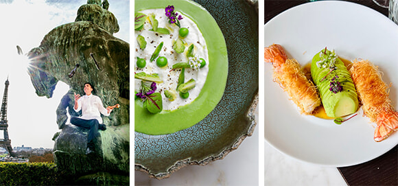 左: シェフのフォディ・フレム。 中: 前菜、ストラチャテラとグリーンピースのガスパチョ(24ユーロ)。 右: 大西洋のラングスティーヌのカダイフ巻き(42ユーロ)。 前菜といってもボリュームがしっかりとある。photos:(左・中)Pmonetta、(右)Mariko Omura