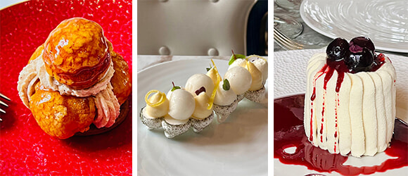 左: プラリネとパッションフルーツのサン・トノレ(17ユーロ) 中: レモンとハーブのパヴロヴァ(16ユーロ) 右: バスク地方の名産チェリーのフォレ・ブランシュ(18ユーロ)