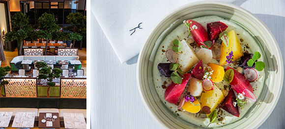 左: 植物を配した内装のレストラン。 右: 自然の美しさは料理にも。前菜の「Jardin de l’Homme」(24ユーロ)。photos:Pmonetta