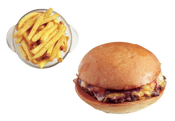 左:サイドメニューのフライドポテト「Frites」4.50ユーロ 右:M.O.F.(フランス国家最優秀職人章)のパン職人に特注したポテトバンズに熟成肉のステーキ、燻製パストラミ、オニオンコンフィ、4種のチーズを挟んだバーガー。肉汁ベースのディップを付けて提供する贅沢な「French Dip」(13.90ユーロ)はフードコート店限定。パリではまだ数少ない鉄板で焼いた牛肉を挟んだスマッシュバーガーも話題だ。