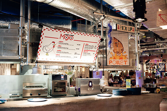 昨年10月、3500㎡の広さを誇るフードコートがモンパルナス駅の近くに誕生。レストランを次々と手がけ流行を牽引するモマ・グループが経営、監修はパリでストリートフードイベントを主催するヴィルジニ・ゴダールが担当。人気シェフのフライドチキンからタパス、クレープ、韓国料理、カクテルまで、15のレストランと3つのバーが入店し、夜はDJイベントも開催。一日中楽しめる、パリの旬を反映するフードスペースだ。