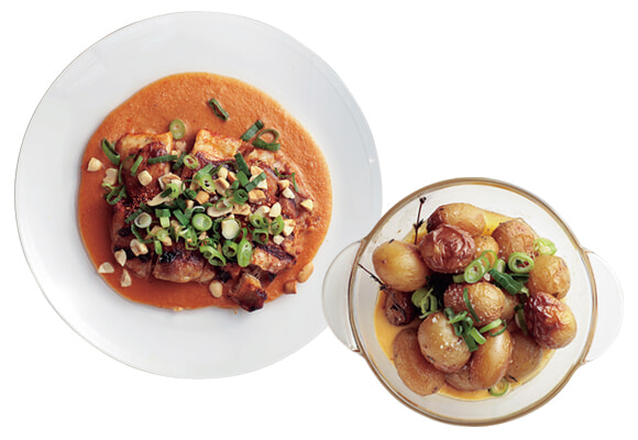左:西アフリカとアジアの影響を受けたフランス料理で知られるサコらしい料理が味わえる。看板メニューは、ピーナッツのソース”マフェ” をかけたフライドチキン「Maffe Pressed Leg」10.50ユーロ 右:サイドのジャガイモはチェダーチーズとともに。「Pommes Grenailles」6ユーロ。そのほかハーブ風味のチキンの丸焼き、鴨首肉の串焼きなどをラインナップ。