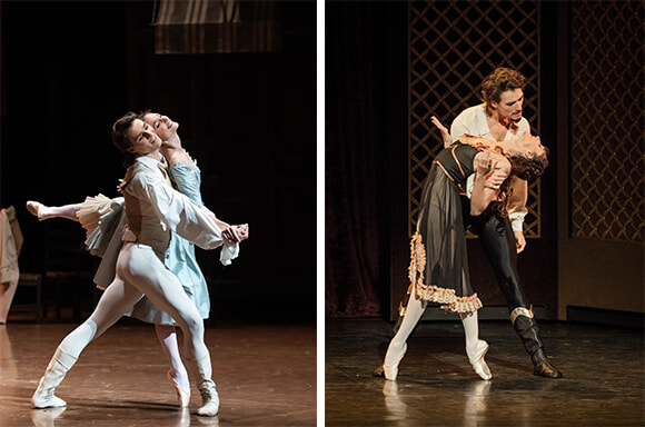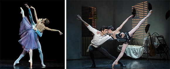 ケネス・マクミラン振付のドラマティック・バレエから、ドロテ・ジルベールとユーゴ・マルシャンは『マノン』(左)と『マイヤリング』を踊る。photo:(右)Ann Ray