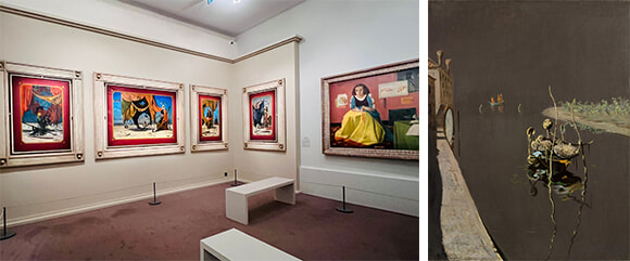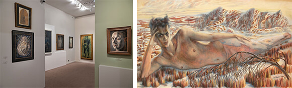 左: ポスタービジュアルの『Sunset (Medusa)』を描いたウージェーヌ・ベルマンもまたロシアのサンクトベテルブルクの裕福な家庭に生まれた。兄レオニッド・ベルマンとともに革命を逃れ、1917年にフランスへ。1935年アメリカへ移住する。映画『風とともに去りぬ』でレット・バトラーの愛人役を演じた女優オナ・ムンソンと結婚するが、鬱気味の彼女は1955年に自殺。写真の展示は『After Picasso』の著者ソビーからの依頼で制作した5点、その右はパリの前衛芸術のパトロンのマリー=ロール・ドゥ・ノワイユ。 右: 兄のレオニッド・ベルマン。貧困、彷徨を描き暗い作品が多い弟に対し、レオニッドは海の風景などを好んで描いた。写真は『Malamocco, Lagune Vénétieenne』(1948年)。photos:(左)Mariko Omura、(右)Collection de Georgy et Tatiana Khatsenkov ©︎ Maxime Melnikov