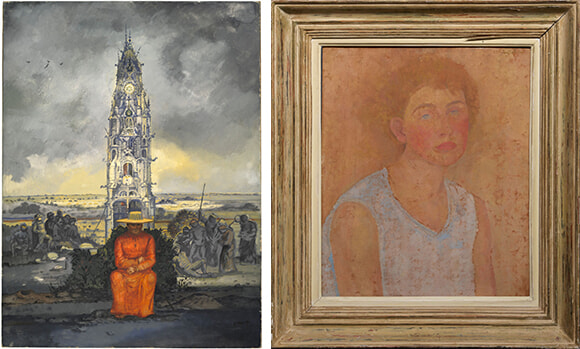 左: クリスチャン・トニー『D’apres Van Eycke(Gertrude Stein)』(1930-36)©︎ Allen Phillips / Wadsworth Atheneum 右: ネオ・ロマンティック派には珍しいフランス女性画家。『若い女性の肖像(自画像)』(1948年頃)個人所蔵、©︎ studio Christian Baraja SLB