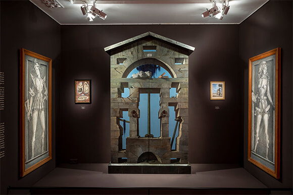 まずは「ヴァンドーム広場17番地、1939年7月5日」。 第二次世界大戦時ニューヨークに移住し、画商として名声を築く前の若きレオ・キャステリがここで登場する。資産家の妻を持つ彼は、1939年に友人のルネ・ドゥルアンとふたりで、ヴァンドーム広場17番地に画廊を開く。この画廊でアーティスティック・ディレクションを任されたのがレオノール・フィニ(1907~1996)だった。マックス・エルンスト、サルヴァドール・ダリ、パヴェル・チェリチェフ、ウージェーヌ・ベルマンなどといった友だちを持つ彼女は、この画廊のためにウージェーヌ・ベルマンとともに、”人間の形をした家具”をテーマに廃墟化した小部屋をイメージしたのだ。このためにベルマンによって制作されたトロンプルイユの衣装家具はロンドンのヴィクトリア&アルバート博物館が所蔵し、彼女による2枚のパネルは個人所蔵である。1939年の展示以来初めて、この展覧会で当時のように展示されているのだ。