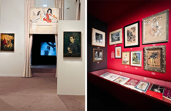 左: クリスチャン・ベラールの絵画の下を抜けて、ふたつ目のパートへ。奥に見えるスクリーンで『ペーパー・ボール』を鑑賞する。 右: 劇場の催しのポスターやプログラムなどを多彩に展示。photos:Mariko Omura