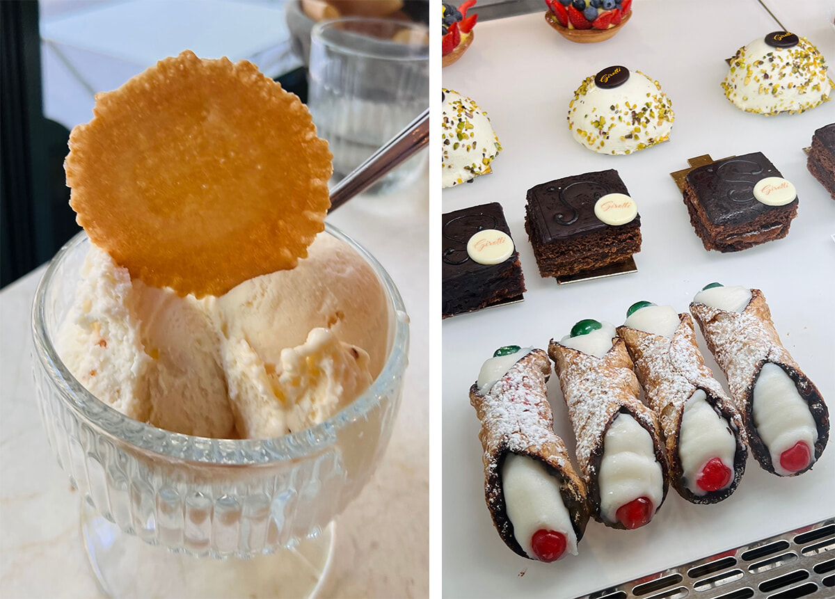 左: ジェラートのイートインはクラシックなガラスのうつわで。 右: ウィンドウに並ぶイタリアン・パティスリー。photos:Mariko Omura