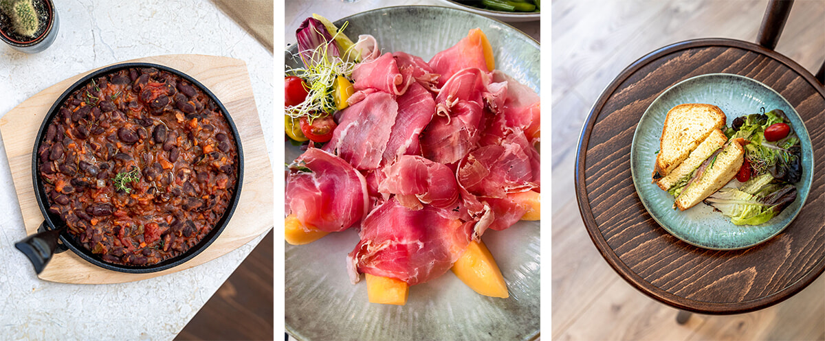 ランチメニューより。ラザニア、スープ、フォカッチャ、サラダ……日によっては生ハムとメロンも。photos:(左・右)Leo Kharfan、(中)Mariko Omura