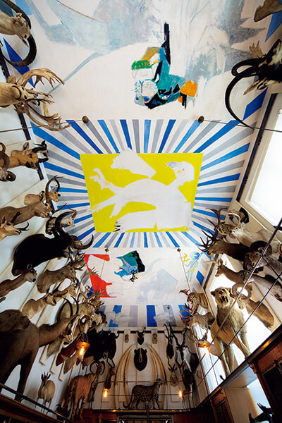 鹿や虎などの狩猟のトロフィがずらりと並ぶ部屋。天井画は、博物館オープンの1967年に描かれたもの。当時はブーイングを呼んだという、画家ベルナール・ロルジュの作品。