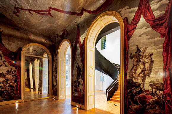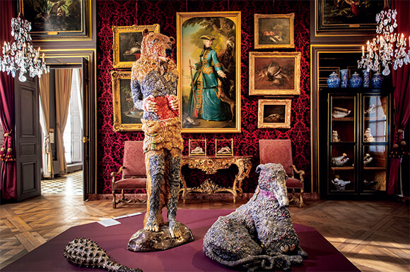 狩猟と自然保護をテーマにした個性派美術館が居を構えるのは、マレ地区の17世紀の邸宅。その佇まいと名称から、動物の剝製や猟銃の並ぶ重厚な展示室を想像しがちだが、館内に足を踏み入れると、明るい雰囲気に驚かされる。階段を上がると、そこはフランスの貴族の邸宅らしい趣を生かしたシックなフロア。「鹿と狼」「犬」「武器」などのテーマに沿って、18世紀や19世紀の狩猟の様子や、動物、自然をテーマにした絵画やデッサン、オブジェなどのコレクションが展示されている。狩猟自然博術館が多くの現代アート作品を所蔵、展示していることはあまり知られていないが、2年間の拡張工事で完成した最上階では、環境保護を強く打ち出す現代アーティストの大きな作品の展示が可能になり、リニューアルオープンのシンボルになっている。進化論のダーウィンをイメージしたキャビネットの中に映画『猿の惑星』の撮影シーンの写真が飾られていたり、トロフィの部屋の動物の剝製の中にニコラ・ダロ作の吠えるイノシシが紛れ込んでいたりと、エスプリの効いた展示も魅力のひとつだ。