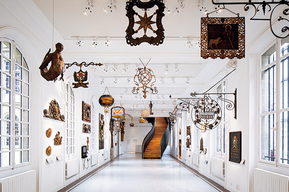 錠前、パン、武具店……。パリの街を彩ってきたさまざまな看板が見学者を迎える真っ白なホールは、新生カルナヴァレの象徴。1914年当時の看板の展示を再現したもの。今回のリニューアルでは、一般から特別に募った寄付3万ユーロあまりの資金で16世紀から20世紀の看板が古の姿を取り戻した。