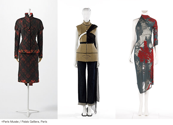 左:アレキサンダー・マックイーン、1997-98秋冬オートクチュールコレクション「Eclect Dissect」より。中:メゾン マルタン・マルジェラ、1997年春夏プレタポルテコレクション「Stockman」より。右:マルティーヌ・シットボン。1997年秋冬プレタポルテコレクション「Les Arbres」より。いずれも『1997 ファッション・ビッグバン』展より。