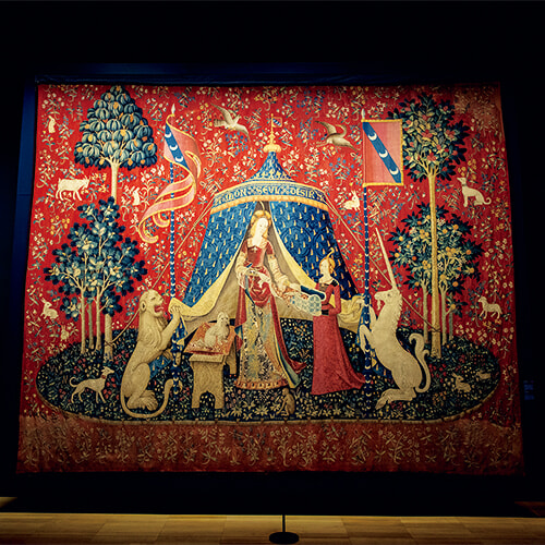 クリュニーといえば、『貴婦人と一角獣』。味覚や触覚などの五感と、『我が唯一の望みに』(写真)と題した1枚を加えた、15世紀の6枚の連作タペストリー。貴婦人はいずれも違う衣装に身を包んでおり、楽器や鏡、食器などの調度品も細やかに表現されている。