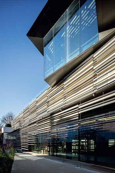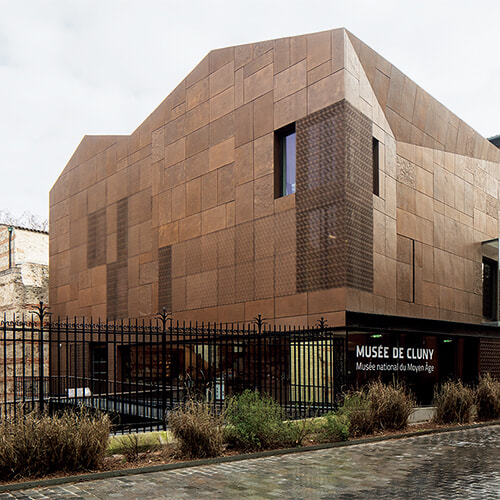 新美術館のロゴマーク的存在はエントランスの建物。建築家ベルナール・デムランが考えたのは、紀元1世紀末の遺跡と中世の建築を結ぶ架け橋。表情の違うさまざまなアルミのプレートを組み合わせた外壁が、コンテンポラリーながら石造りの歴史建築と調和する。