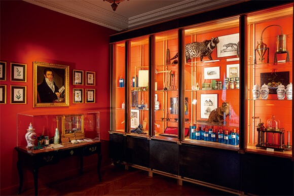19世紀の合成香料のパイオニアと言われる調香師、ルイ・トゥーサン・ピヴェールの肖像画のある展示室は、調香師の部屋がイメージ。ガラスケースには香料の原料が見える。