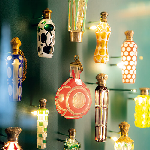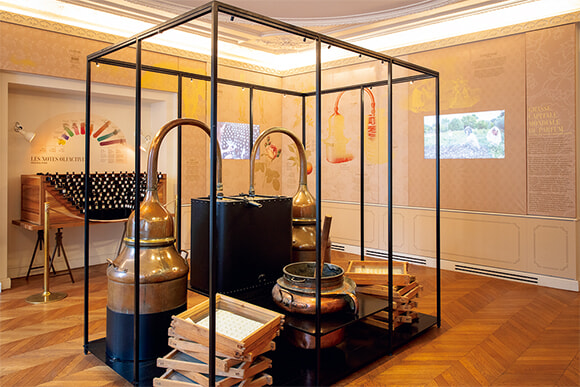 1926年創業のフラゴナールは、3人のコスタ姉妹による生活雑貨も人気のフレグランスブランド。彼女たちの父に当たる先代オーナーはアートを愛し、50年代から香水の歴史にまつわるオブジェを収集、コレクターとして知られた人物だったという。彼の残したコレクションが公開されているのが、本拠地グラースとパリにある香水博物館だ。古代エジプトから20世紀にいたるまでの香りとビューティの歴史を辿る展示には、コール入れ、旅用の化粧道具入れ、香合などのコレクションが並ぶ。ことに18世紀、19世紀の香水瓶の美しさには目を奪われる。19世紀の調香師の部屋をイメージした香料の展示室や、前世紀の花の収穫と香りの抽出を撮影した映像もあり、香水大国フランスならではのミニミュージアムだ。