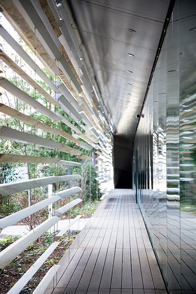 隈研吾による新館には常設展のメイン展示、企画展、ブティック。街と庭園を切り離しつつ、すだれ風の外壁で、庭との繋がりを意識。