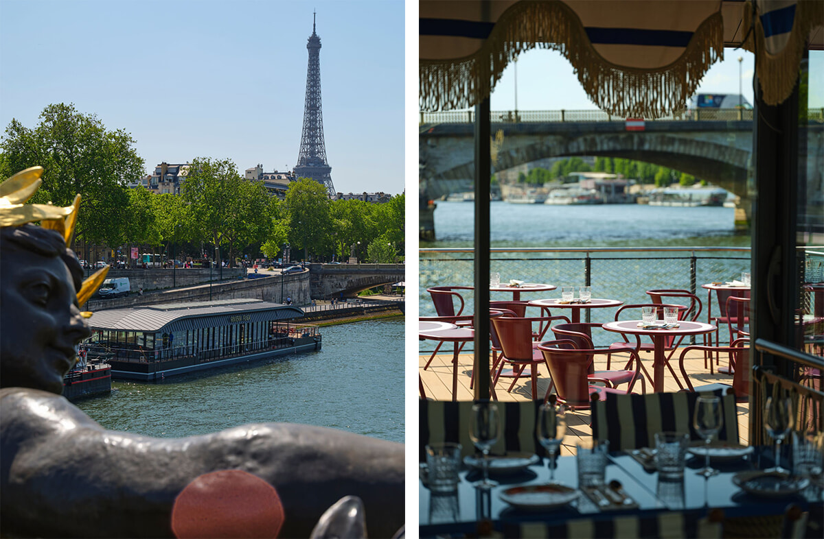 アレクサンドル3世橋のたもとに浮かぶ 船上レストランのリヴィエラ・フーガ。photos:Pierre Lucet-Penato