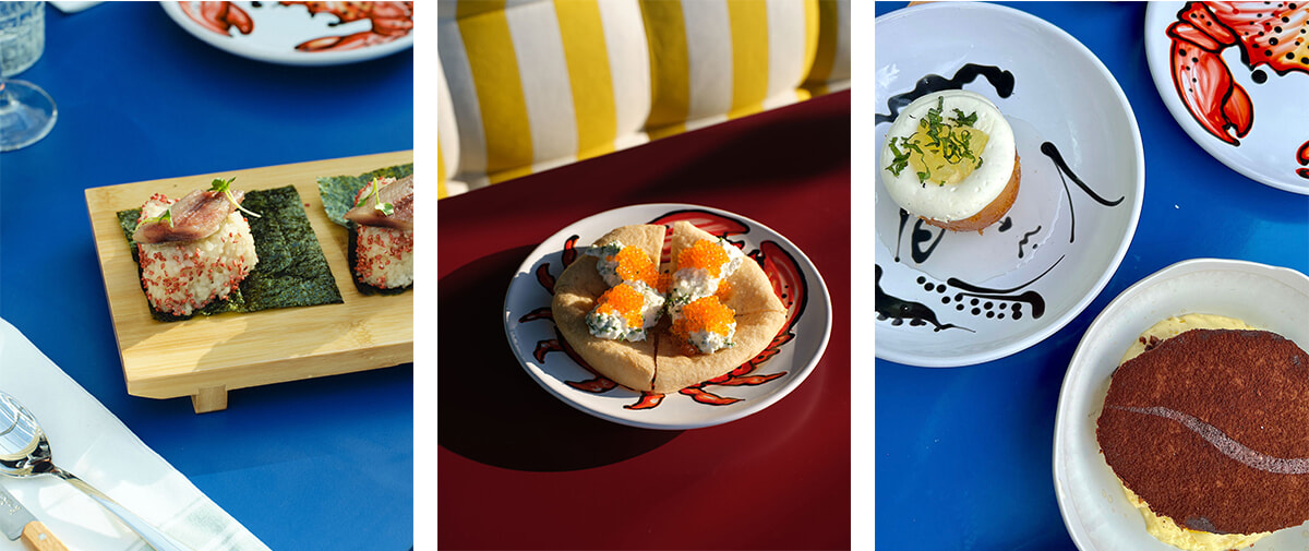 左: 手巻き風寿司 中: タパスメニューから。マスの卵を乗せたフライドピザ(13ユーロ) 右: デザートから。ババサケ(奥)はラムの代わりに日本酒が使われている。ミスはウィスキー味のティラミス。photos:(左・中)Pierre Lucet-Penato、(右)Mariko Omura