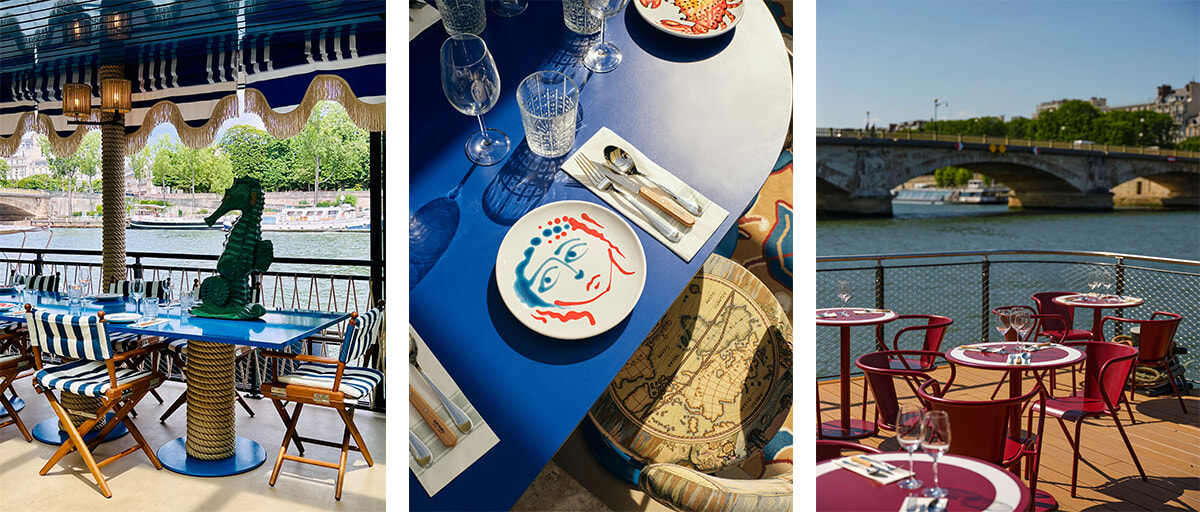 左: ロープやストライプが船旅気分を演出。 中: バーカウンター席の椅子は地図モチーフだ。 右: デッキ席でセーヌの川風を感じて。photos:(左)Mariko Omura、(中・右)Pierre Lucet-Penato