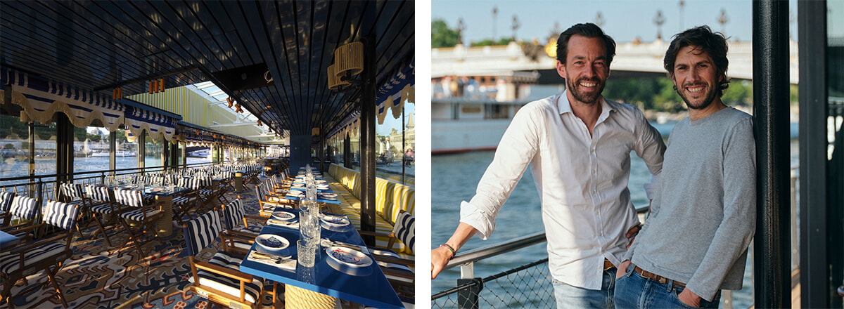 リヴィエラ・フーガはピエール・ドゥーブレとカンタン・ダロー・ドゥ・ラバールのふたりによるフーガ・ファミリーの3つ目のプロジェクトで、彼らは”パリにいながらパリから脱出”をコンセプトにしている。このリヴィエラ・フーガの船内のインテリアをふたりが託したのはストゥディオ・JPドゥメイエー。幅広ストライプが60~70年代の気分を演出し、食卓にはロープを巻いた脚のテーブルや船で使われるデッキチェアが。床は庭を思わせるオリジナルカーペットである。ガラス屋根の下あるいはデッキのテラス席……観光船が走るとリヴィエラ・フーガも少し揺れる。そんな時に低い場所のテラスにいるとセーヌの水しぶきが足をほんのちょっとだけ濡らすこともあって、リゾート気分が盛り上がるのだ。