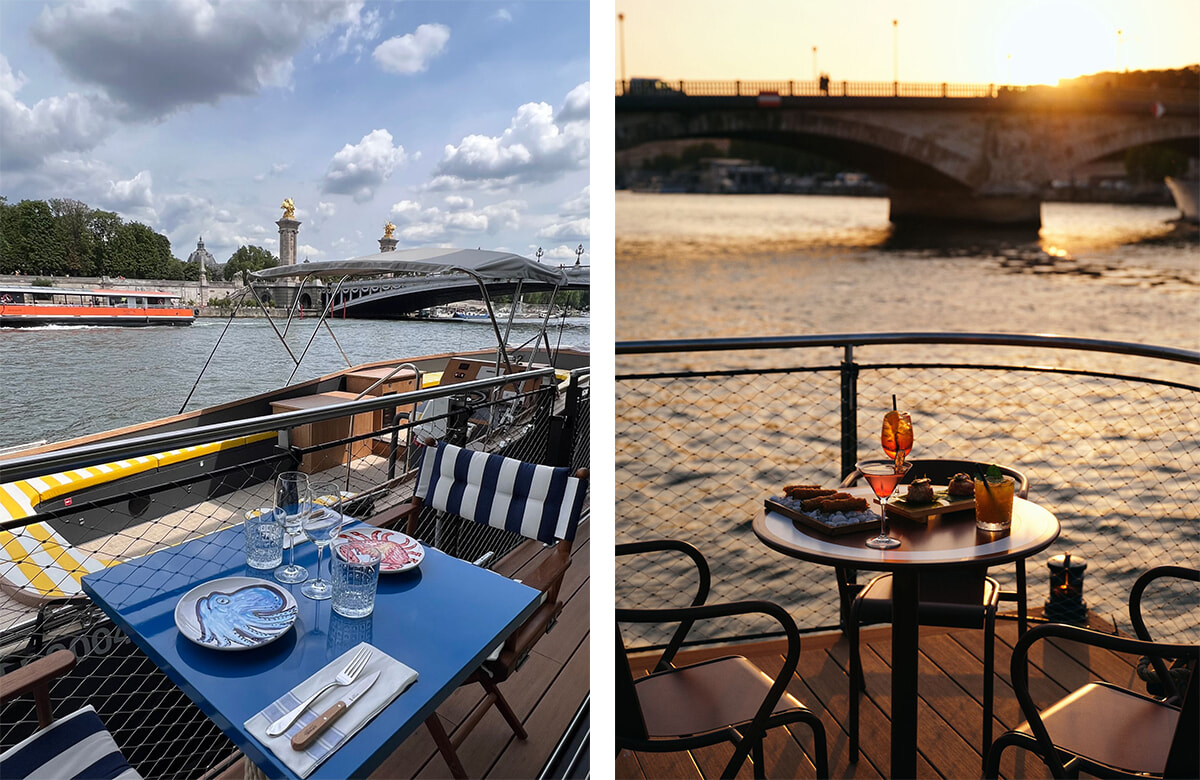 左: 横付けされているボートで食前あるいは食後にセーヌ散策を。5名まで450ユーロ。1名増えるごとにプラス50ユーロで12名まで乗れる。 右: 日没の遅いパリの夏をデッキ席で満喫! photos:(左)Mariko Omura、(右)Pierre Lucet-Penato