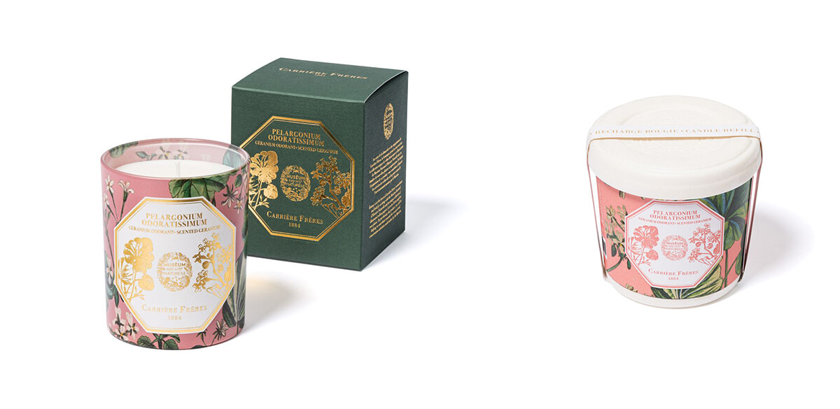 木、花、フルーツ、ハーブの単一の香りのキャンドルでおなじみの創業1884年の「Carrière Frères(カリエール・フレール)」。昨年、5区の自然史博物館と提携して発表したアカシア、スイレン、ニガヨモギの3種の香りのパフュームキャンドルに、最近ゼラニウムが加わった。調香師セルジュ・ド・オリヴェイラはヴェルサイユ・シェーヴルルーにある137種の植物が育てられている温室の中で1日を過ごし、4種目の香りとしてペラルゴニウム・オドラティッシムムという香り高いゼラニウムを選んだ。グレープフルーツ、ルバーブ、シトロネラが軽く香る麻の花に似た面を持つゼラニウムの品種である。