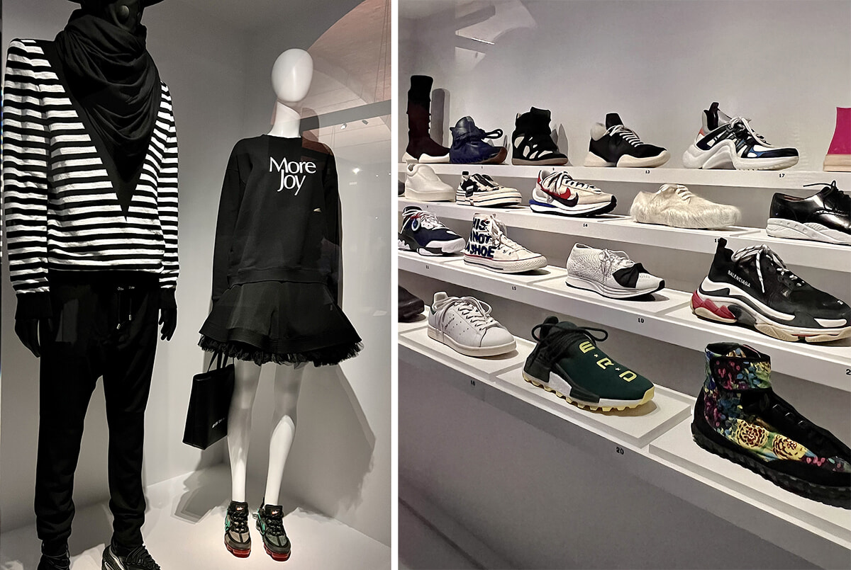 ガリエラ美術館の展示より。左: サラのルックは、スウェットがクリストファー・ケイン(2018〜19年)、スカートがPhi(2006年)、バッグがコム デ ギャルソン(2017〜18年)、スニーカーはナイキ エア ヴェイパーマックス(2009年)。 右: スニーカーの展示。photos:Mariko Omura