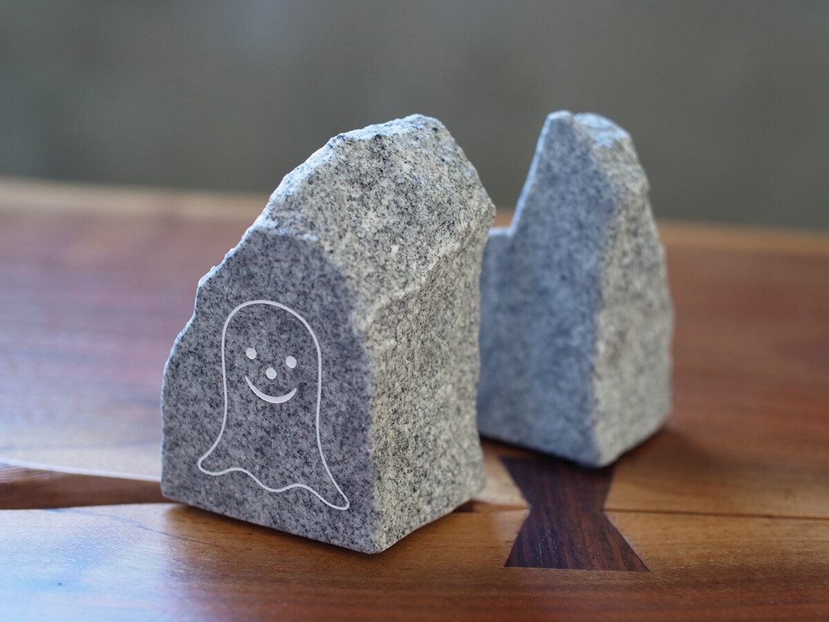 ジュリー・カワムラによるブックエンドは、高松の八栗五剣山の花崗岩を使用。