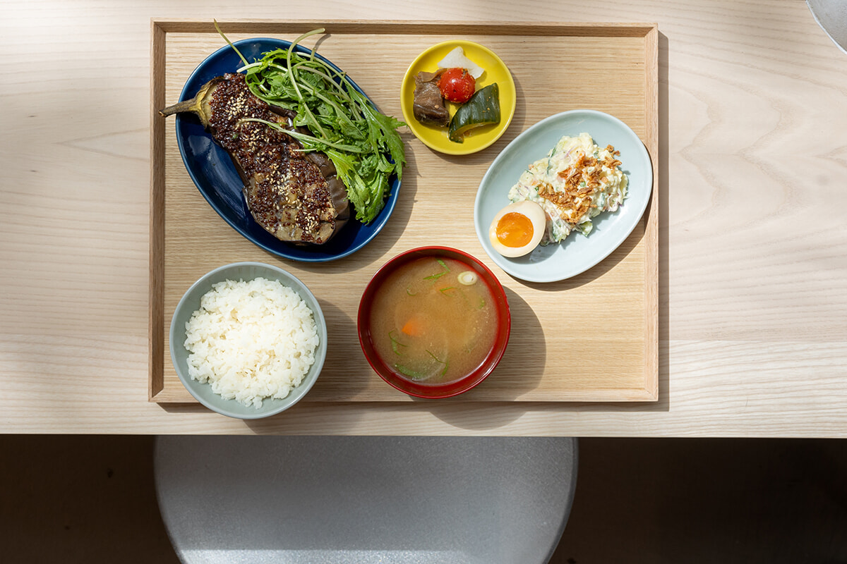 ナスの田楽定食(16ユーロ)にはポテトサラダも付いている。カレーライスは14ユーロ〜。photo:Clémence Sahuc