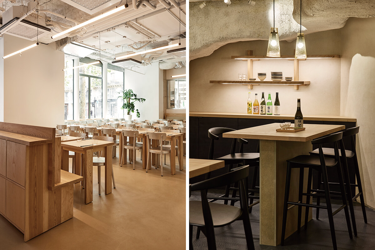 こってりの和趣味ではなく食堂(左)も居酒屋も現代的にまとめられた空間だ。Hugo HaasとYusuke Kinoshitaのデュオが室内建築を担当。
