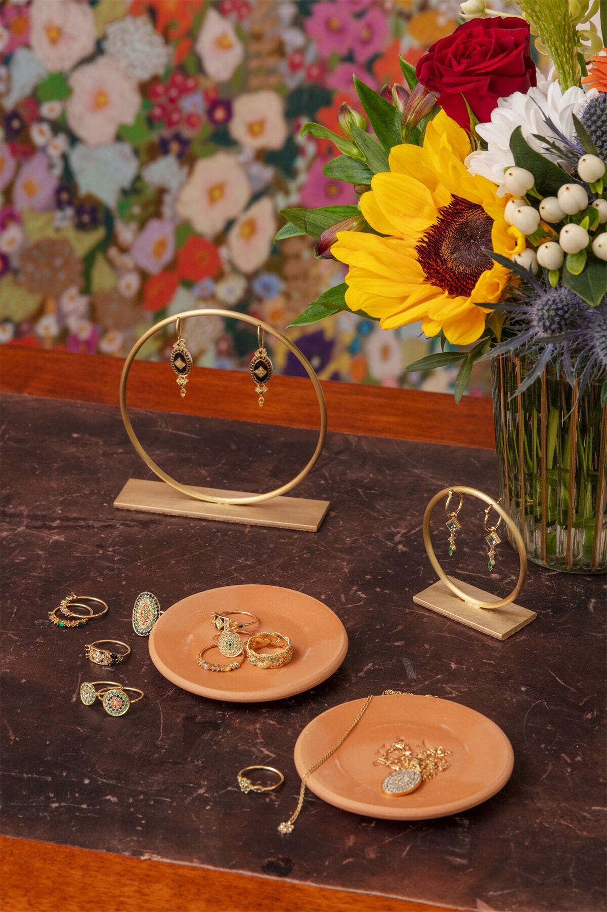 花柄の色鮮やかな壁紙とジュエリーがよく似合っている。