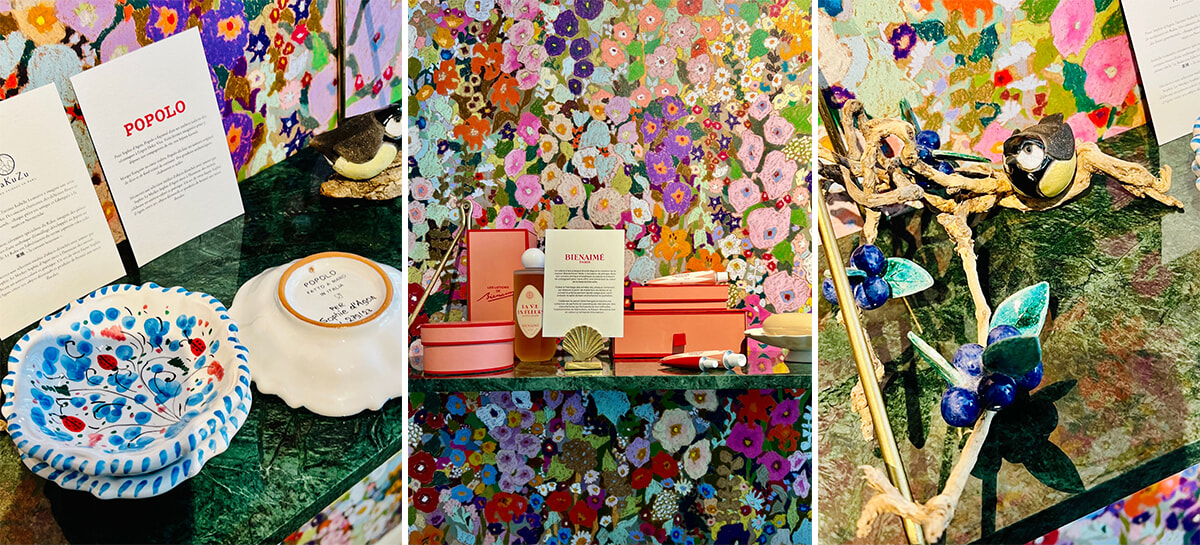 右岸店ではニナ・コルチツカヤが手描きしたフレスコ画がポエティクな雰囲気を店内に生み出していたが、左岸店では花が鮮やかに満開する英国の壁紙が印象的だ。ジュエリーの店であることはもちろんだけれど、こちら左岸店の新たな試みはソフィーズ・マーケット。小さなコーナにソフィーお気に入りのブランドからのセレクションを展示販売している。最初のゲストは、アール・デコ調のパッケージでおなじみのビューティブランド「Bienaimé(ビアンネメ)」、色彩豊かなモチーフのイタリア陶器の「Popolo(ポポロ)」、そして、楽焼の一点ものオブジェを製作するアーティストIsabelle Lemaitreによる「Rakuzu(ラクズ)」だ。