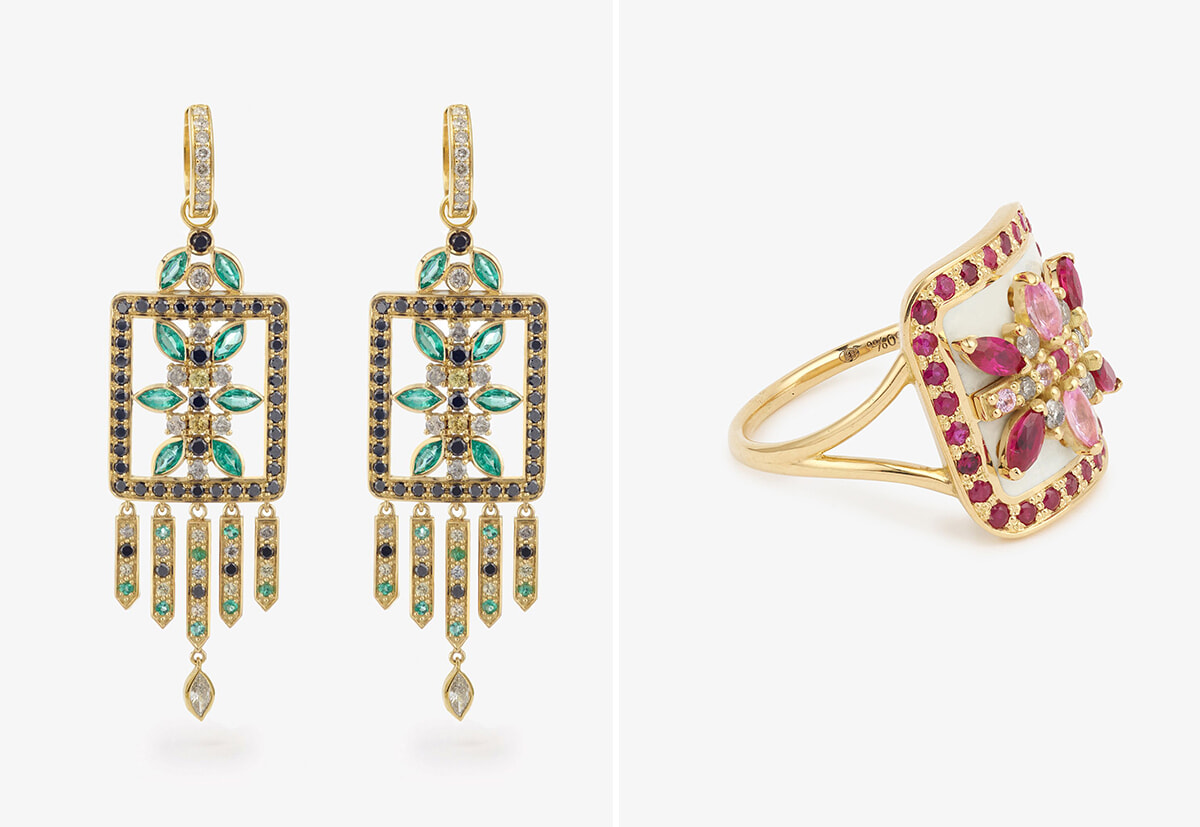 左: Ritaのイヤリング。6,995ユーロ。スクエアのフォルムのエナメルタイプもある。 右: 指輪。ルビー、ピンクサファイア、ソルト&ペッパー・ダイヤモンド、ホワイトエナメル。3,295ユーロ。
