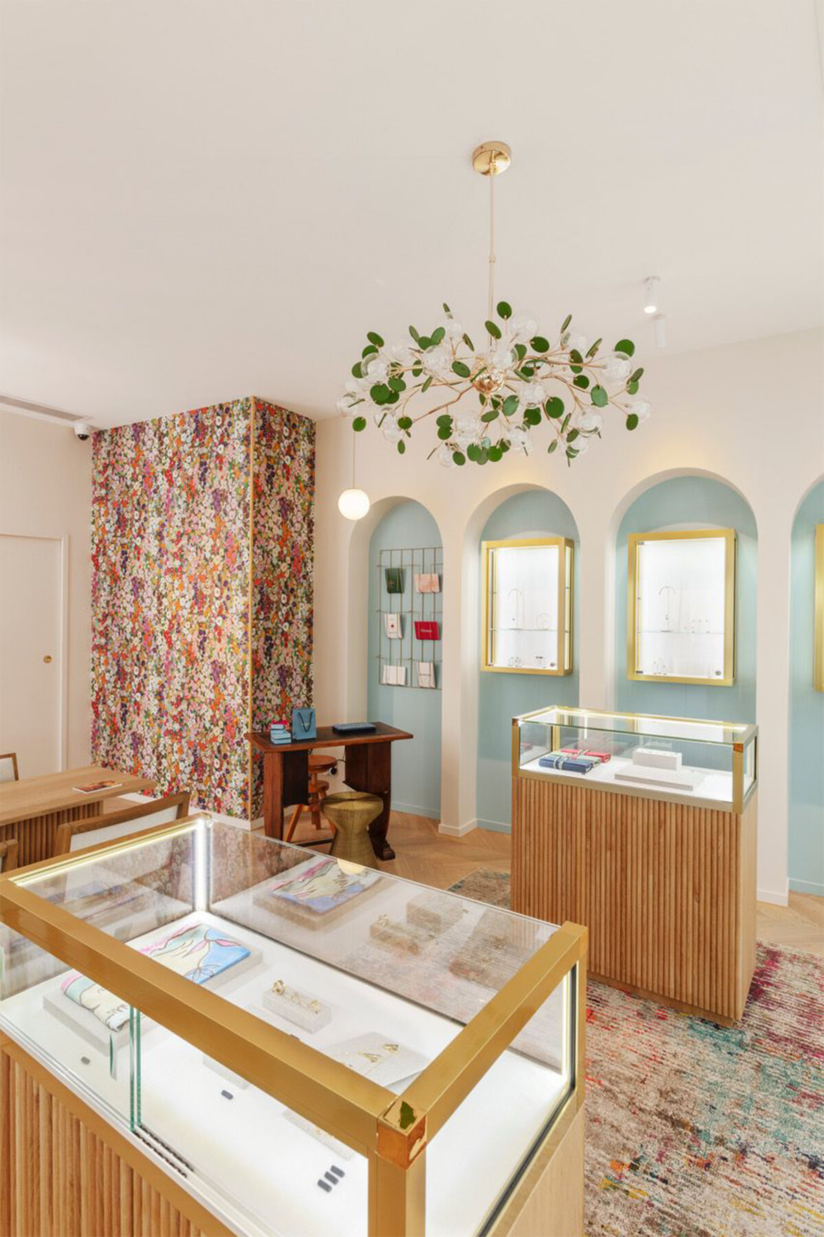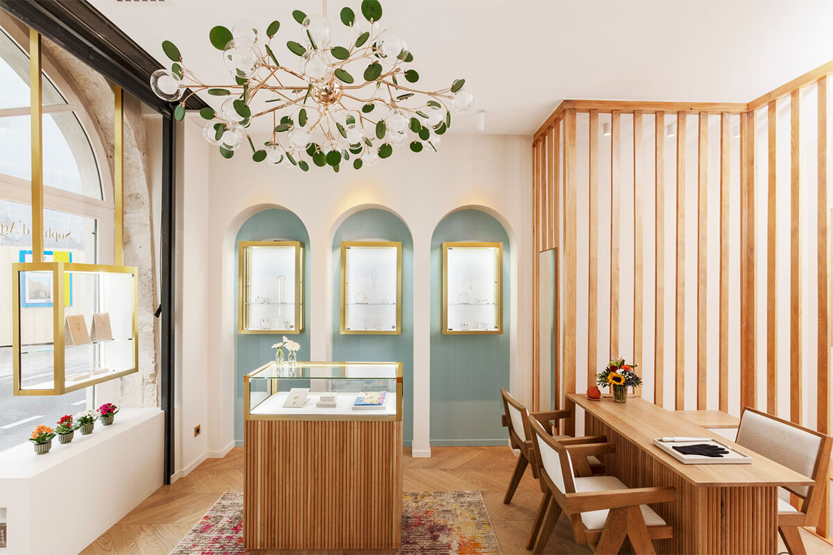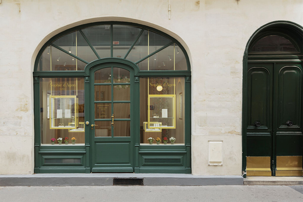 繊細なデザインに赤×グリーン、ブルー×ピンクといったカラーストーンのミックスがリズミカルでチャーミングな「Sophie d’Agon(ソフィー・ダゴン)」のジュエリー。2015年のブランド創設以来、パリジェンヌに愛され、いまでは世界中にファンを増やし続けている。2021年、北マレにブティックができ、そして今年の夏、7区に2軒目がオープンした。フードパッサージュのBeaupassageのグルネル通り側の出入り口の斜め向かいだ。かつてコーヒー豆を焙煎販売していたという店は、半円を描くガラス窓を戴くエントランスが魅力的で、ソフィーは店内もそれに調和をする内装にしたという。