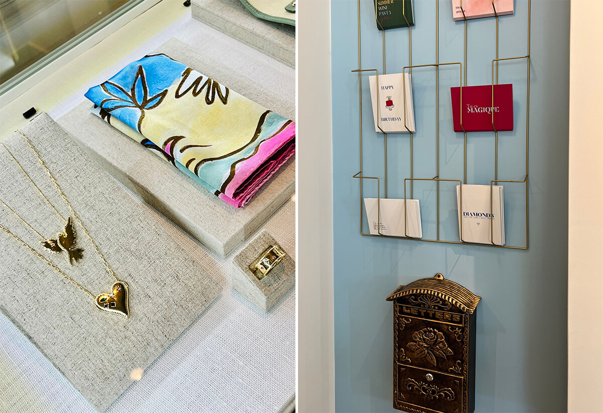 左: コラボレーションのコロンブ・コレクションから、ニナ・コルチツカヤによるスカーフとペンダント。 右: ブティック内に郵便受け。上の絵葉書にメッセージを書いてこの郵便受けに入れると、1年後に配達されるという遊びが楽しめる。photos:Mariko Omura