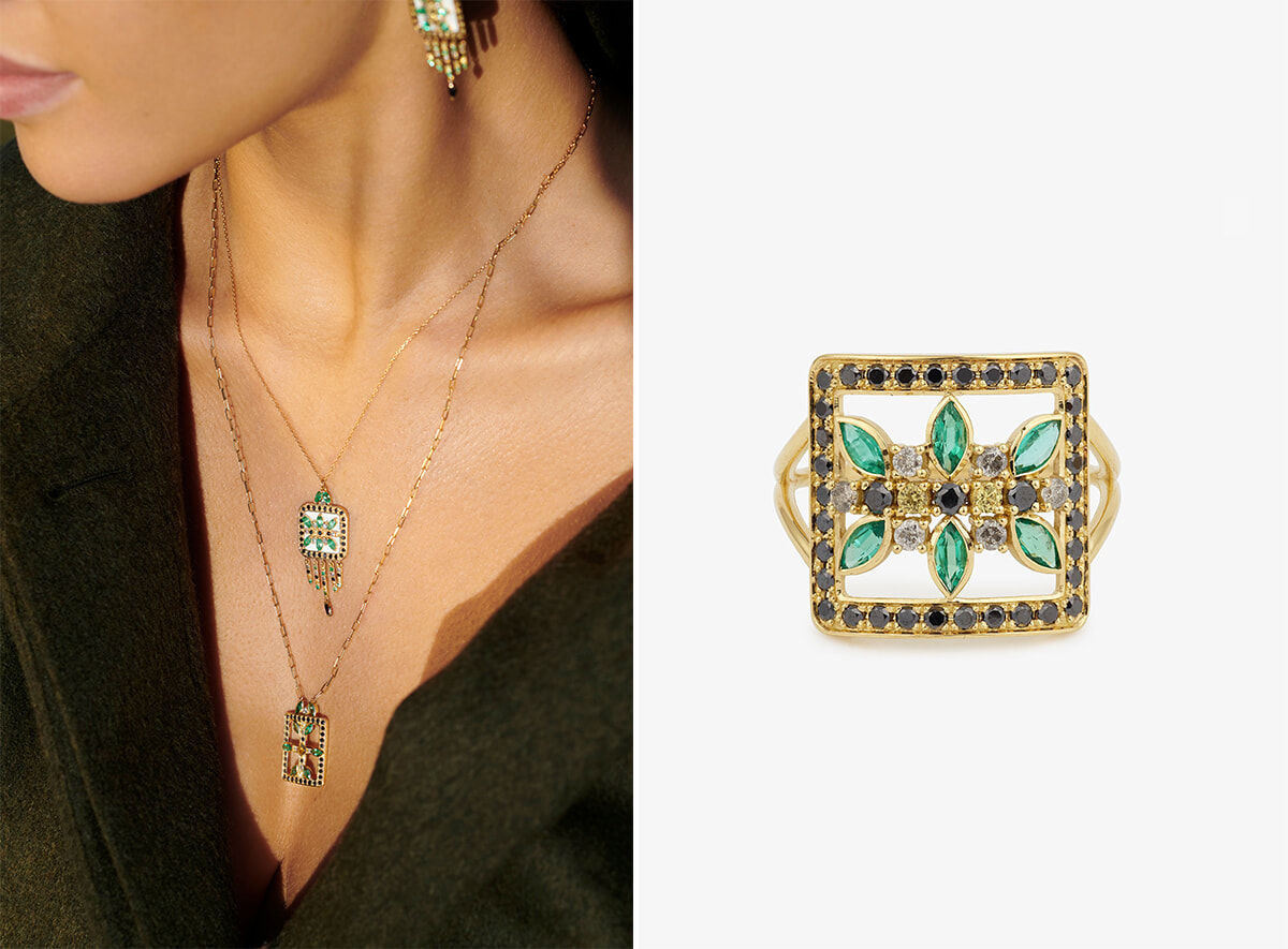コレクションRita。メゾンのほかのジュエリー同様に、このコレクションもアップサイクルの18金を使用している。左: エメラルド、イエロー・サファイア、ソルト&ペッパー・ダイヤモンドのネックレスは上のエナメルタイプが3,995ユーロ、下の透かしタイプが3,295ユーロ。 右: 指輪。エメラルド、イエローサファイア、ブラックダイヤモンド、ソルト&ペッパーダイヤモンド。2,995ユーロ。